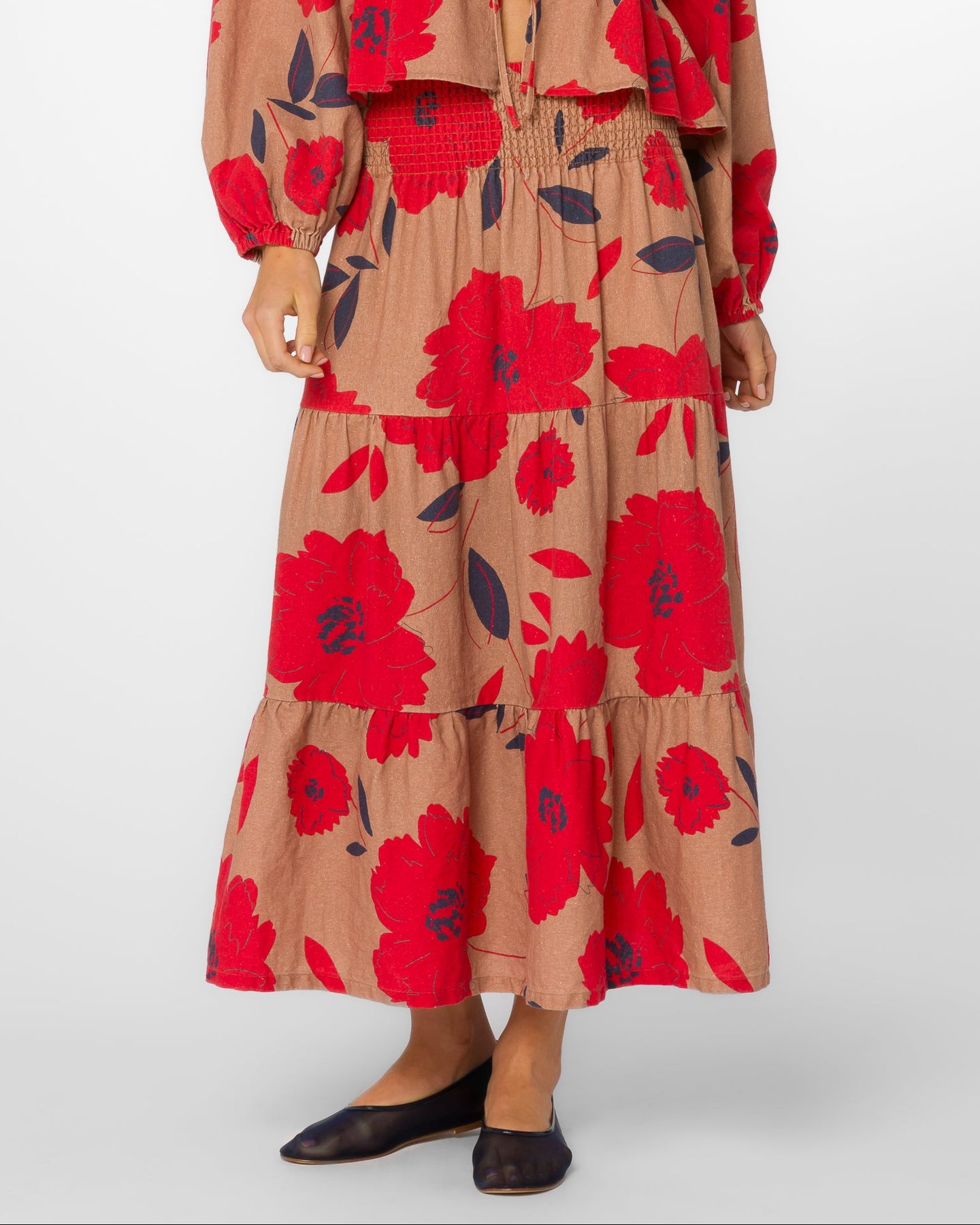 100% Natural fibers printed with gorgeous red florals against a neutral background. Style this with denim jackets, any neutral tanks or casual sweaters. Pair with your favorite pair of leather strappy sandals or neutral ballet flats.